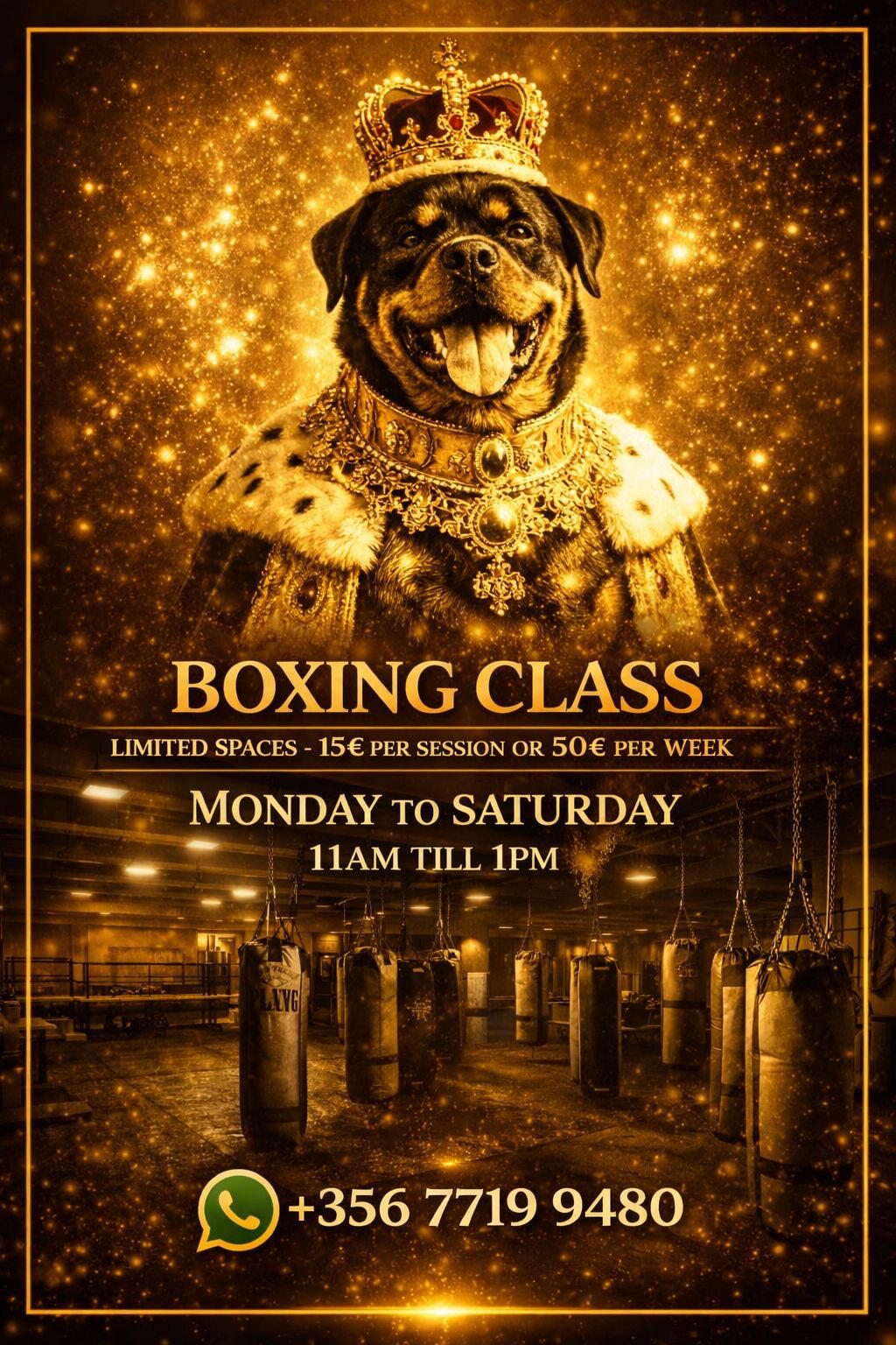Golden Warriors Gym was built from a simple vision: create a place where people can train hard, learn real boxing, and be part of a strong and supportive community.Ruud is the owner of Golden Warriors and the coach responsible for the boxing sessions, focusing on proper technique, discipline, and helping members improve step by step. He is also behind the direction and decisions that shape the gym and the experience members have every day.Alongside him is Cain, the gym’s loyal mascot, who has become a familiar face around the gym and part of the Golden Warriors family.