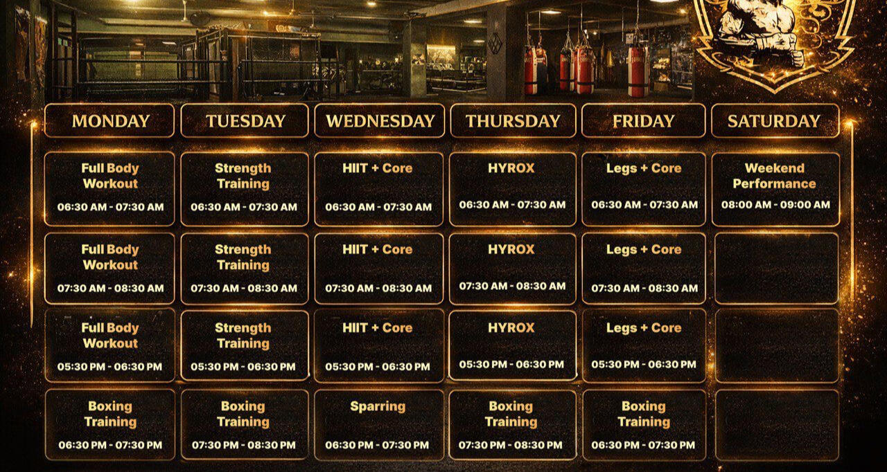 Golden Warriors offers coach-guided boxing and fitness classes throughout the week, with both morning and evening sessions available.